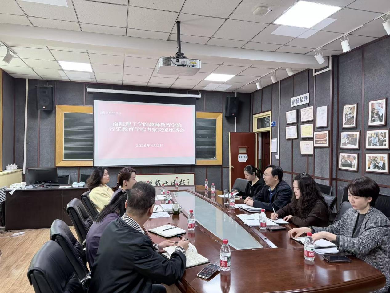 为深化校际音乐教育专业交流合作,分享办学经验,推动音乐教育学科高质量发展,2026年4月2日上午,南阳理工学院教师教育学院副院长钞艺伟带队,音乐学教研室主任舒甜及骨干教师聂一波、刘昕一行4人莅临我院,围绕音乐教育专业建设开展考察交流。音乐教育学院副院长陈青、声乐教研室主任樊萍、键盘教研室主任邓捷及理论教研室主任范文彦热情接待了考察团一行,双方就专业建设、人才培养等核心议题展开深入研讨。