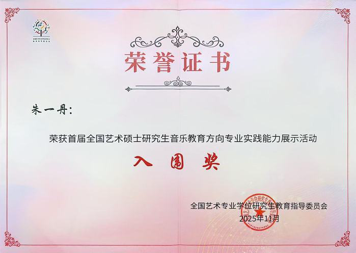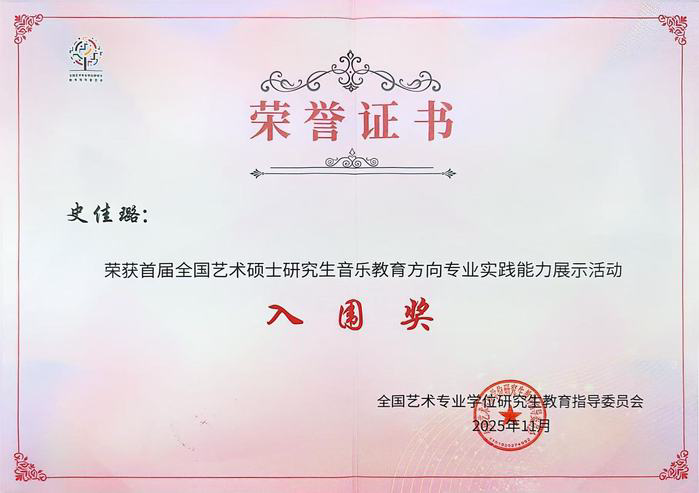 11月5日至8日,由全国艺术专业学位研究生教育指导委员会主办的首届全国艺术硕士研究生音乐教育专业实践能力展示活动在东北师范大学圆满举行。我校荣获“优秀组织单位奖”,音乐教育学院研究生史佳璐(指导教师:赵垒)、朱一丹(指导教师:黄田)凭借过硬的专业功底与卓越的现场发挥,在激烈竞争中脱颖而出,双双荣获“入围奖”,赵垒、黄田两位教师获“入围奖指导教师”称号,充分展现了音乐教育学院在人才培养方面的显著成效。
