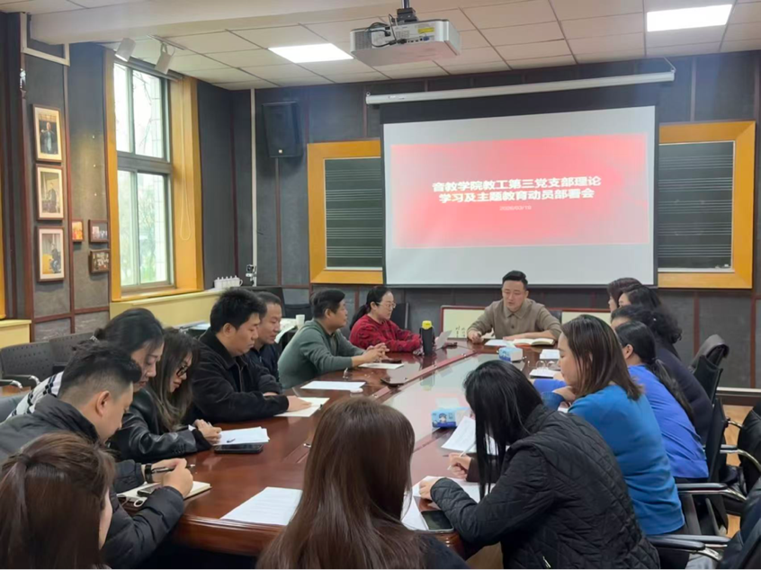 3月19日,音教学院教工第三党支部召开支部党员组织生活会暨学习教育动员部署会,进一步夯实支部党建工作基础,提升党员政治素养与党性修养,会议由支部书记郭晶铭同志主持,全体党员教师参会。
